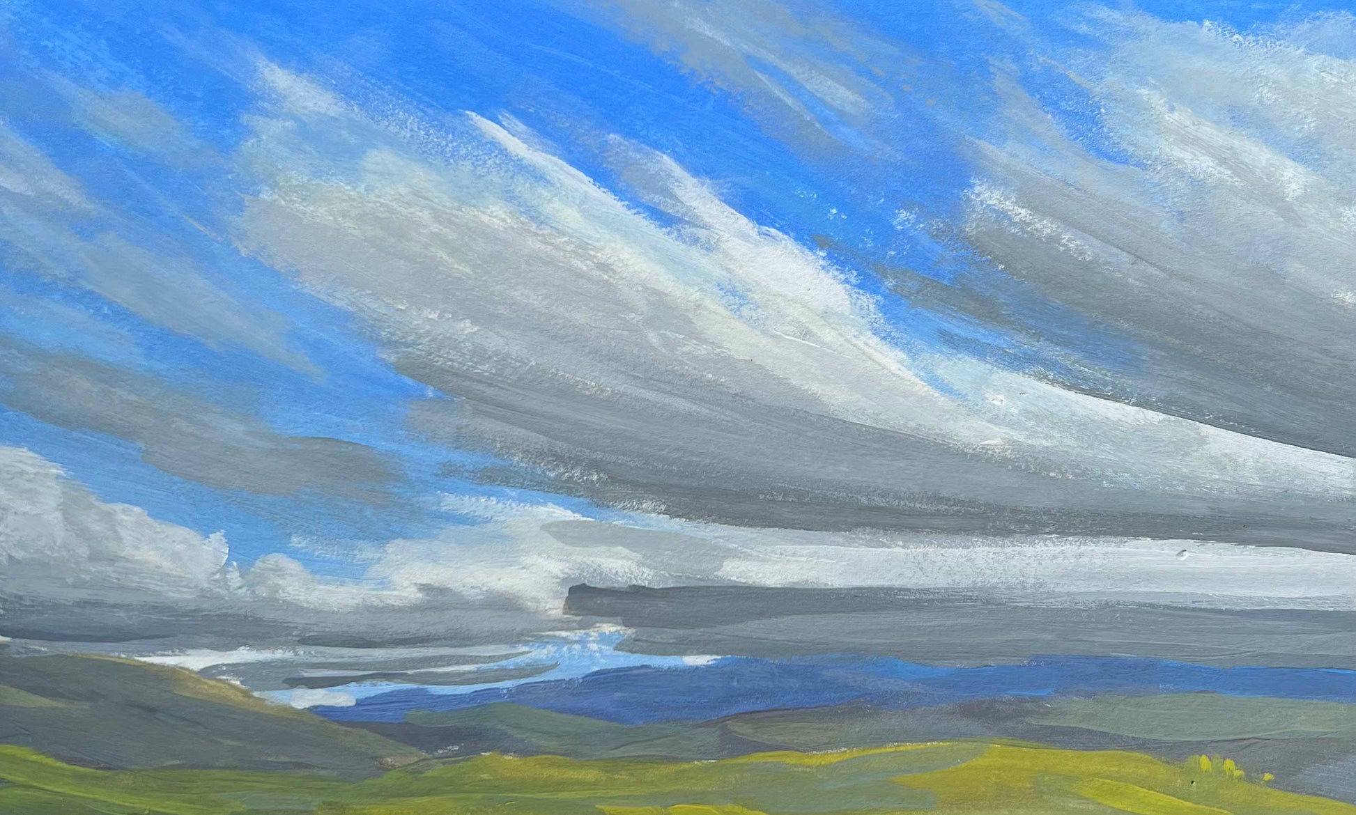 5" x 7" Casein on archival paper. Clouds and green grassy view of east hills, looking south east toward Hobart Bluff, Greensprings area.