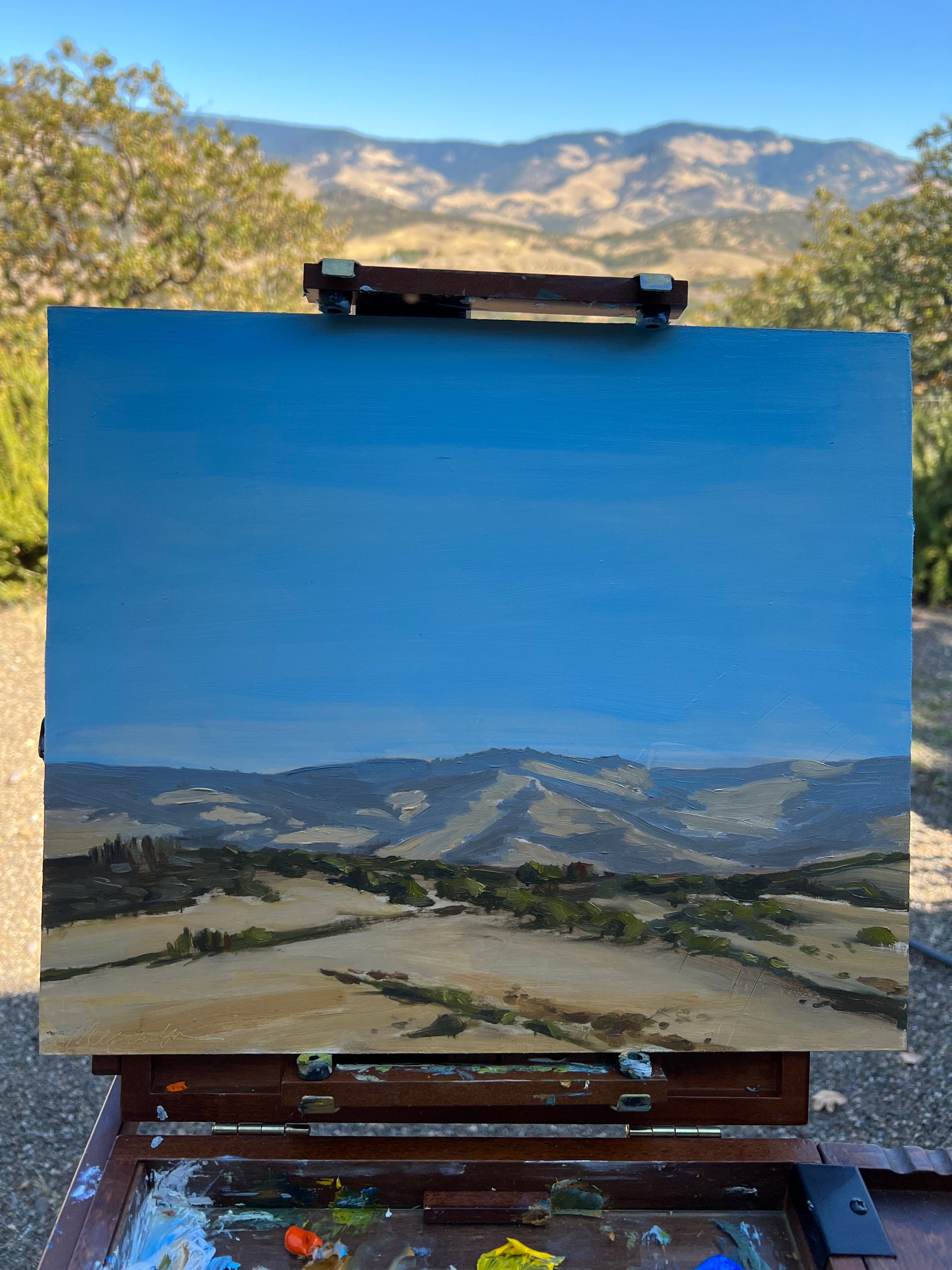 16" x 12" x .25" - Plein air painting done in late August looking east from the middle of the southern end of the Rogue Valley, just south of Ashland, Oregon.