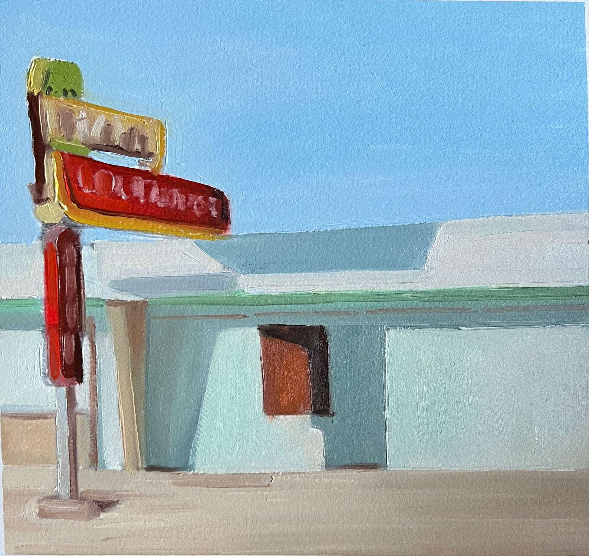 Original oil painting of simple shapes and shadows of a rundown, dead hotel on route 66 in New Mexico. 8.5" x 8.5" oil painting on archival Arches oil paper.