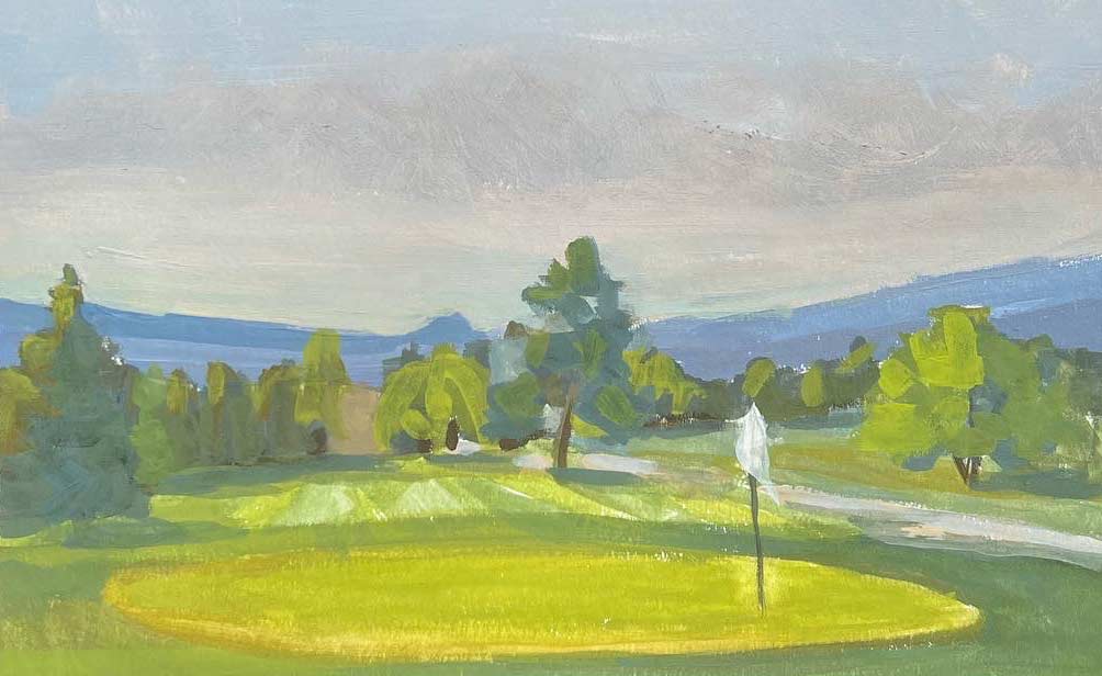 5" x 7" Casein on Archival Paper. Plein air painting of Oak Knoll Golf Course.